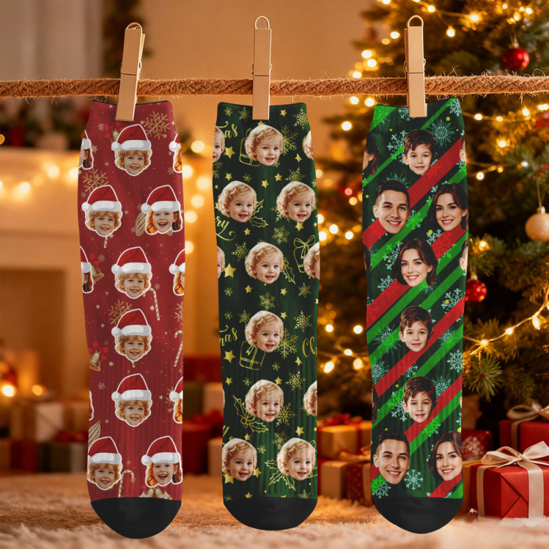 Custom Face Christmas Socks Cute Green Family Photo Santa Sokcs Personalized Photo Xmas Socks Gift