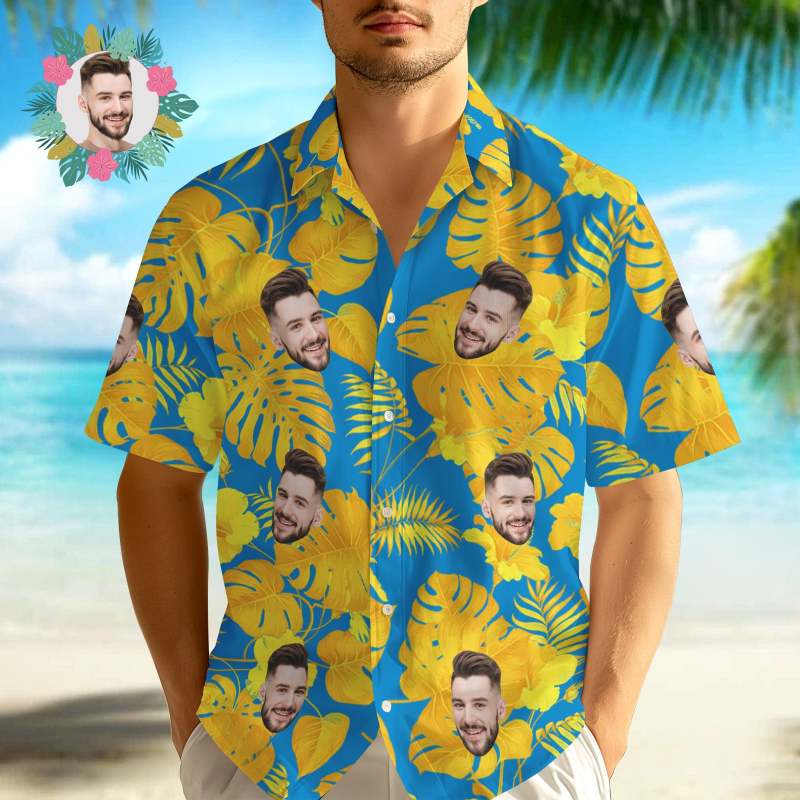 Custom Face Hawaiian Shirts Tropical Yellow Sleeves and Flowers Face Blue Hawaiian Shirt