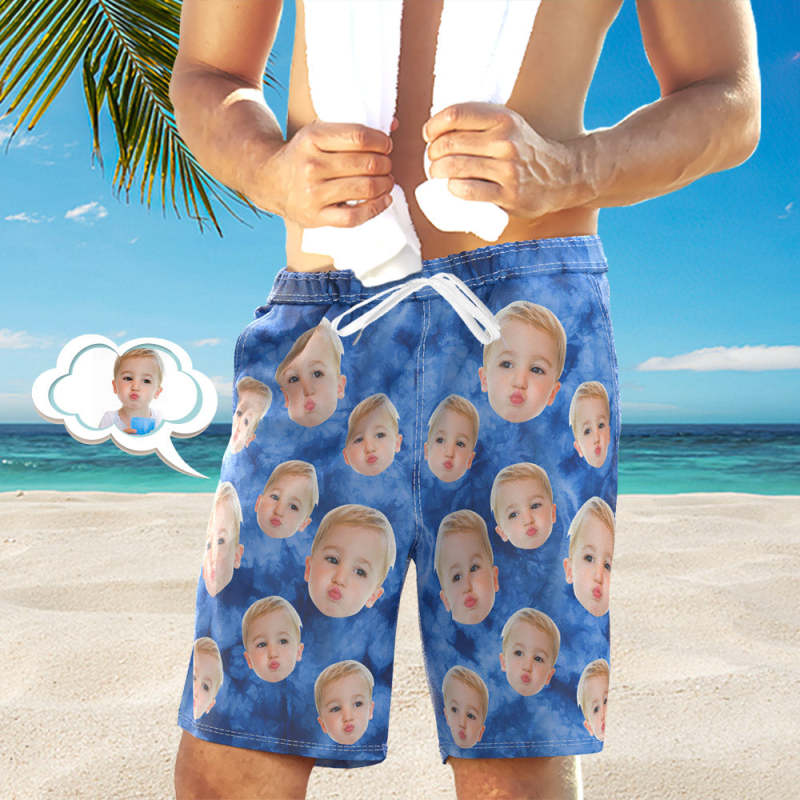 Custom Face Photo Men's Swim Trunk Water Shorts Summer Tie Dye Light Blue