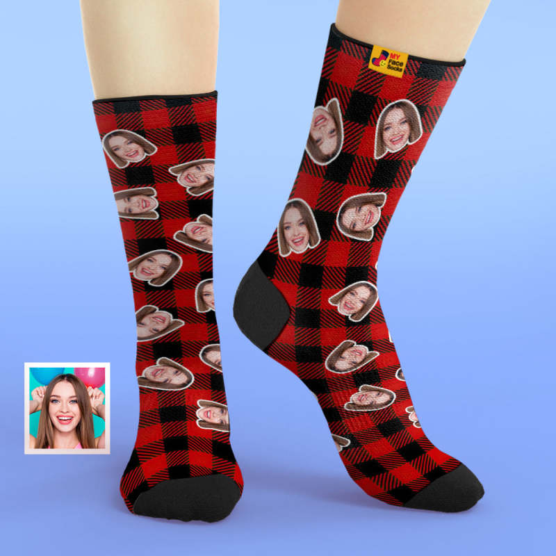 Custom Face Socks Add Pictures and Name Red Plaid Print Breathable Soft Socks