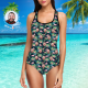 Custom Face Swimwear Women's Photo Slip One Piece Swimsuit Gift For Her - Leaves & Flamingo