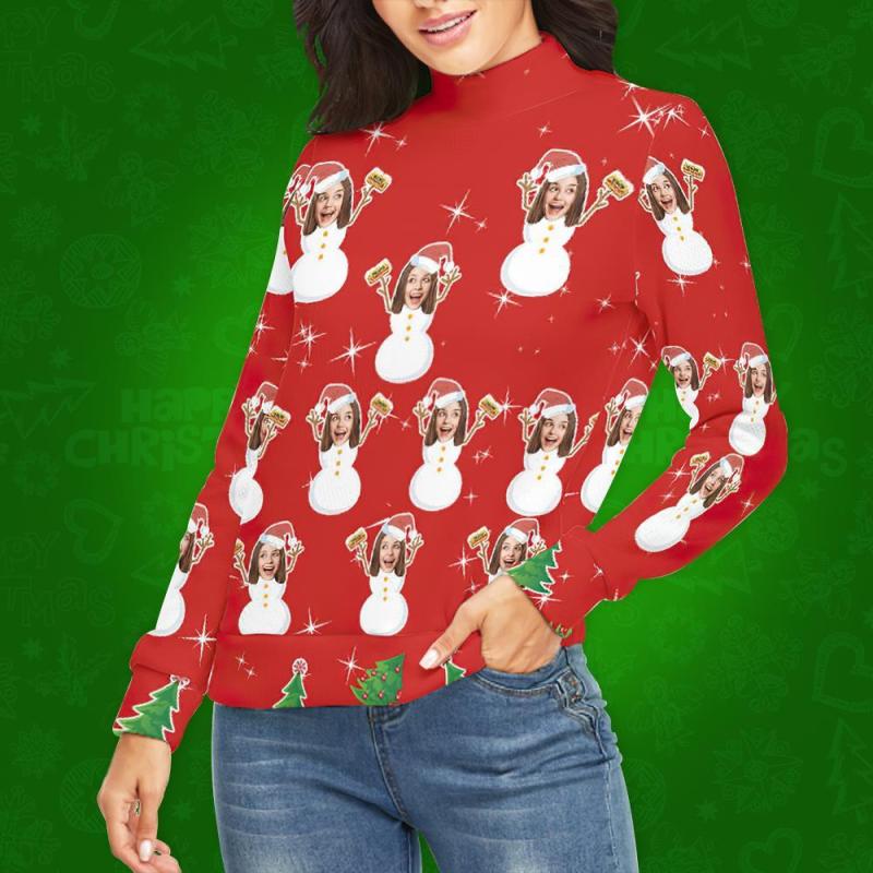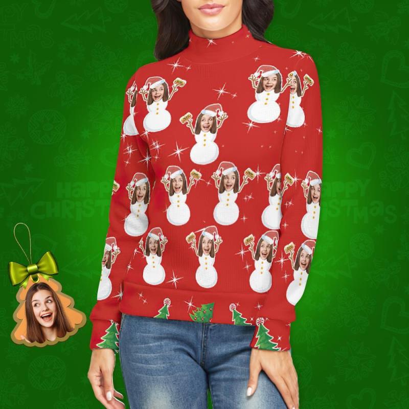 Custom Face Turtleneck for Women Ugly Christmas Sweater Knitted Loose Pullovers - Snow Girl