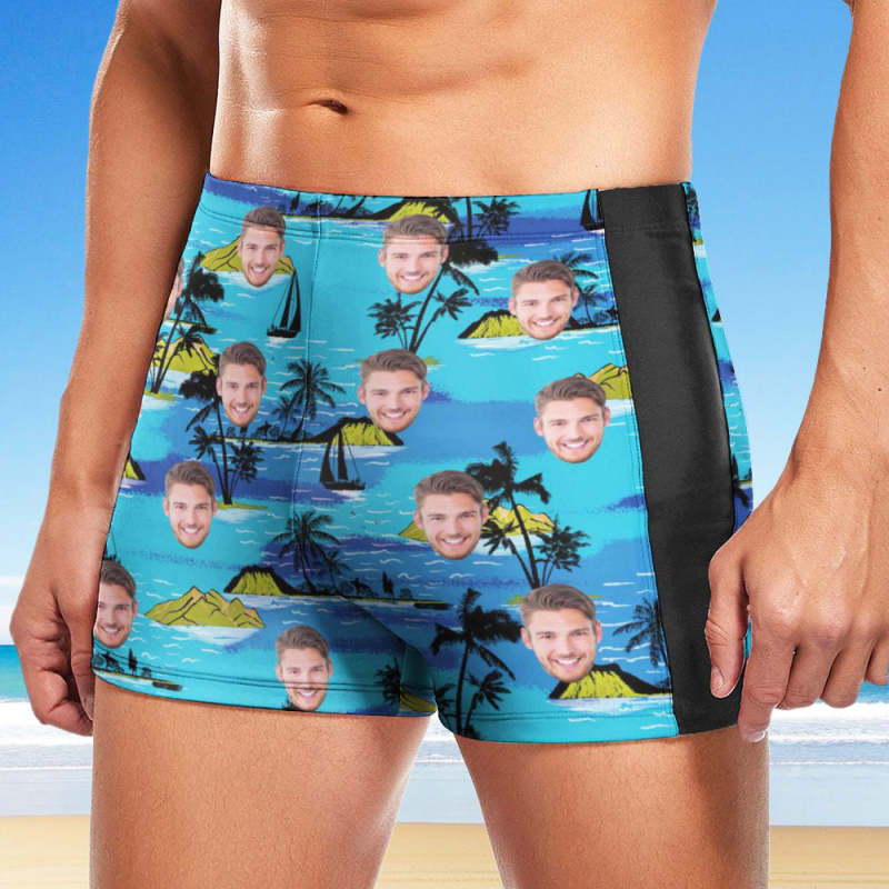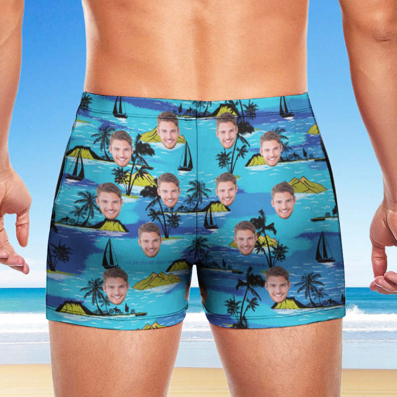 Custom Men's Swim Boxer Shorts, Hawaiian Face Swim Trunks, Peseronalized Swim Briefs - Island Vacation