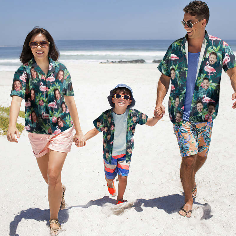 Custom Photo Hawaiian Shirt Parent-child Wears Personalised Face Hawaiian Shirt Gift Flamingo Flower