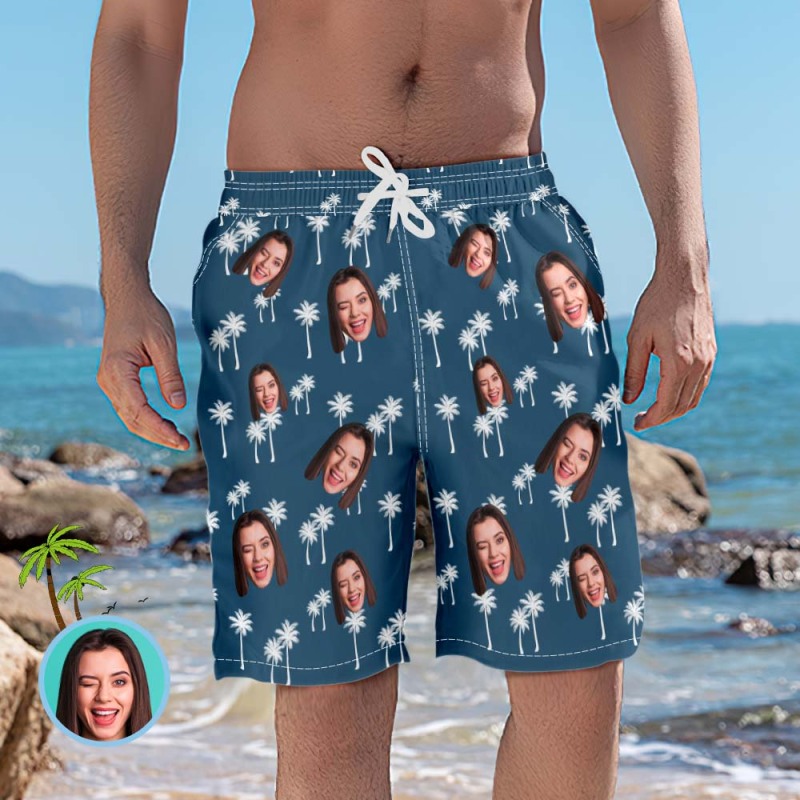 Men's Custom Face Beach Trunks Coconut Tree Photo Beach Shorts Gift for Men