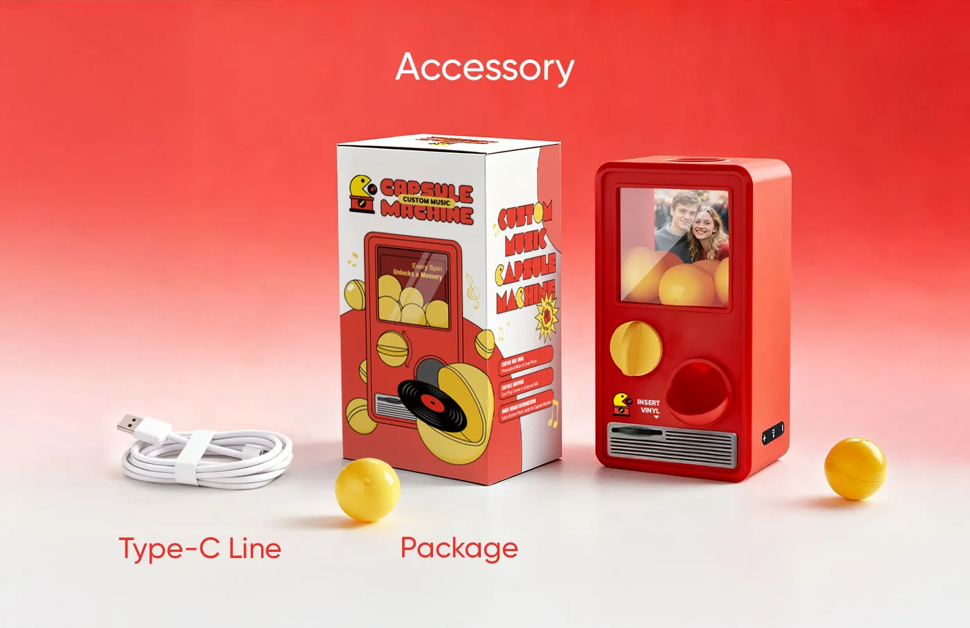 Unwrap the magic of music and surprise this holiday season with our Music Gachapon Machine! Designed to resemble a classic toy vending machine, this festive delight holds up to 7 gachapon balls, each hiding a customizable CD record inside. Personalize every record with a loved one’s favorite song and a special photo-then let the machine bring the joy to life with an instant musical twist!