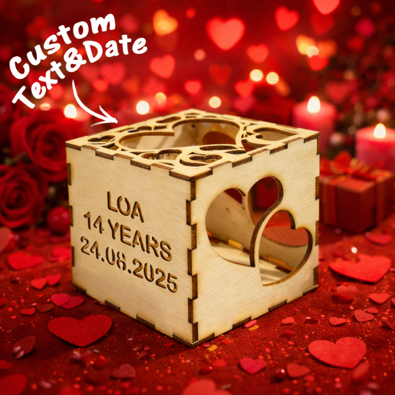 Valentine's Day Personalized Wooden Projection Night Light Cube – Custom Name, Age & Date | Heart Shadow Memory Lamp Gift for Anniversaries